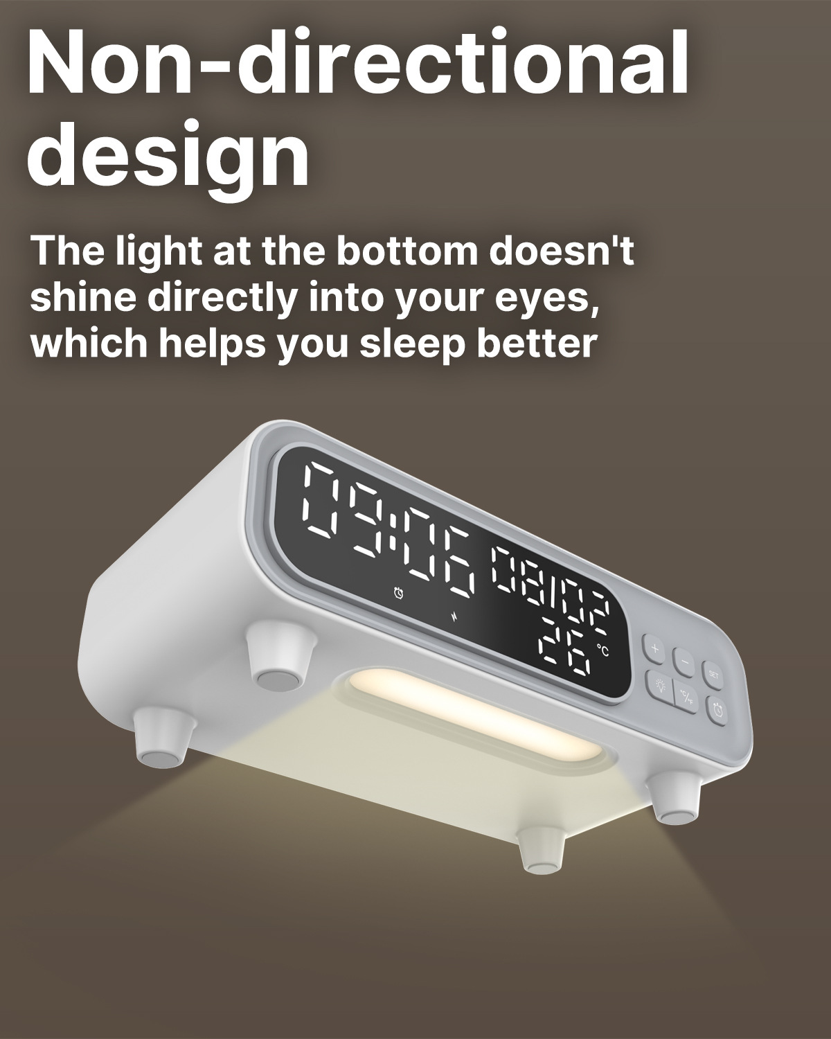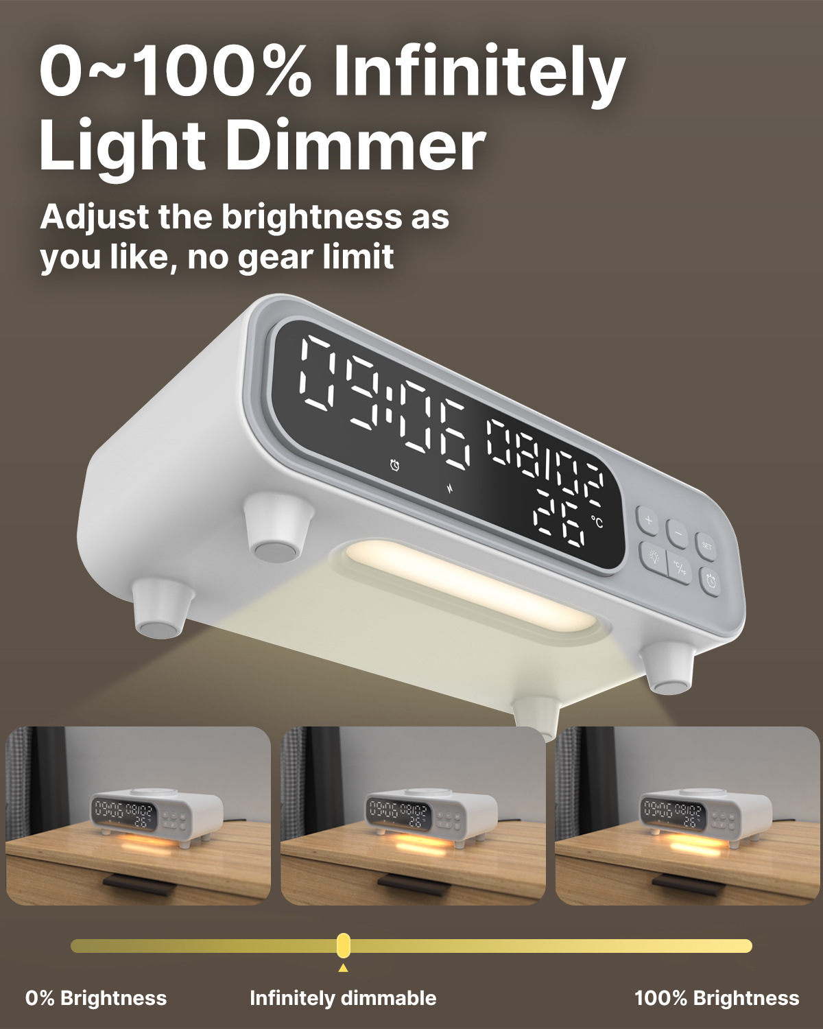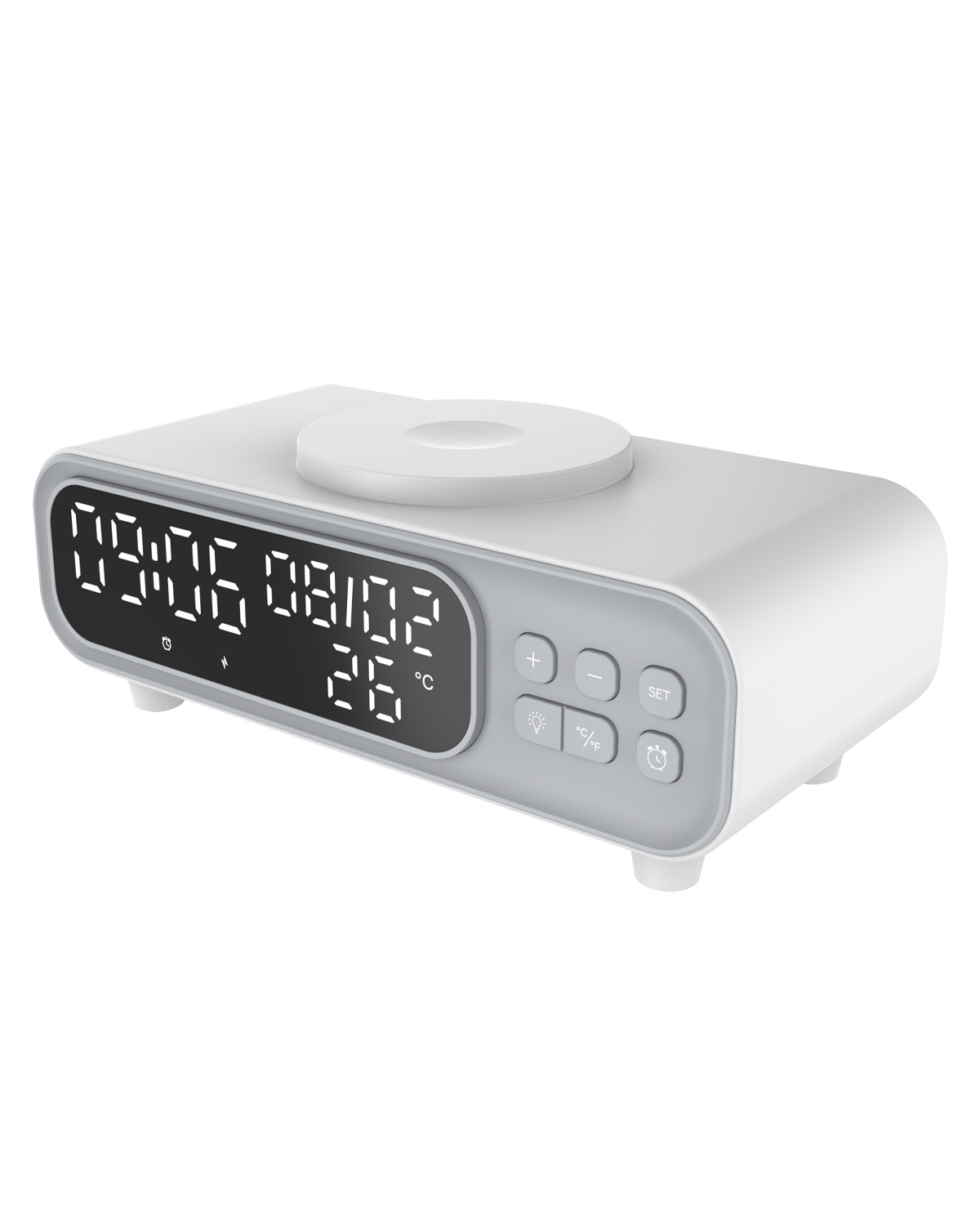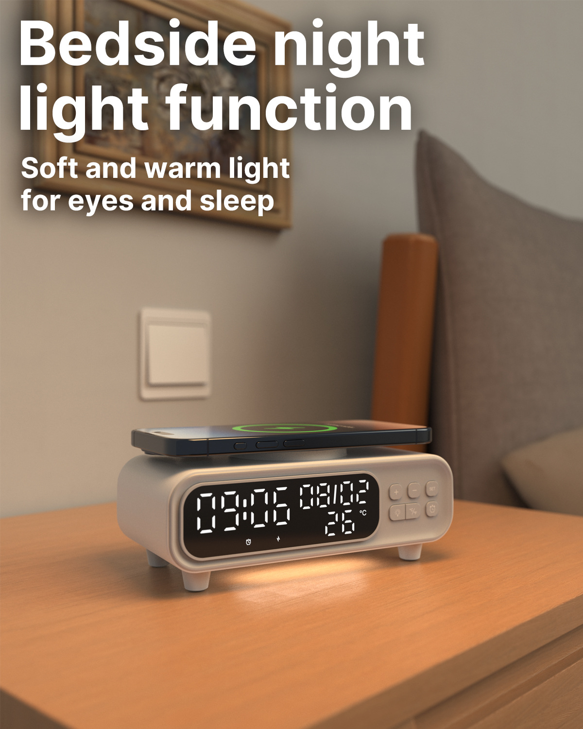 Smart wireless charger night lamp with alarm clock and temperature display. Compact bedside lamp for charging, lighting, and smarter mornings.
