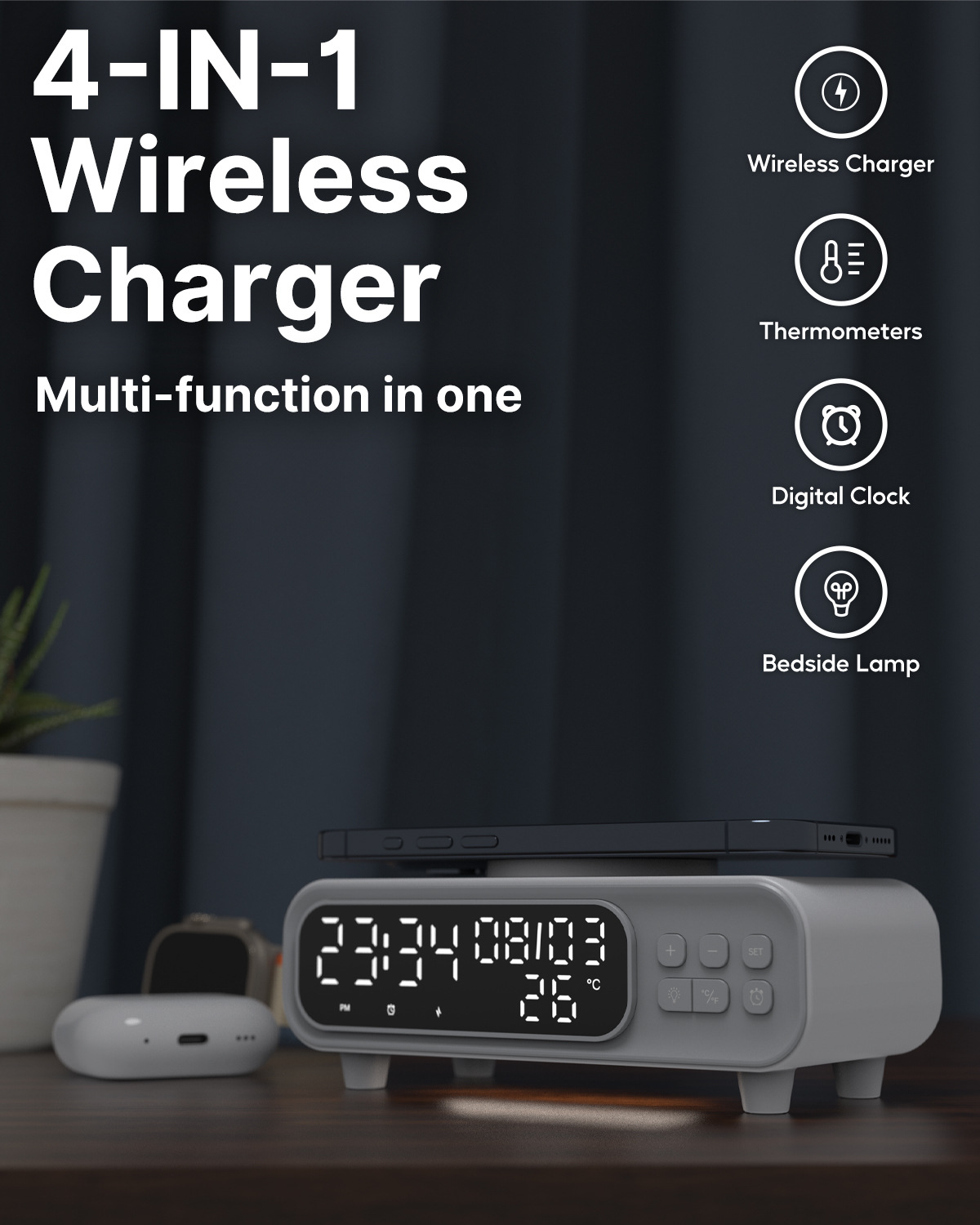 A multifunction wireless charger night lamp featuring soft lighting, alarm clock, and temperature display — perfect for bedside charging and smart daily routines.
